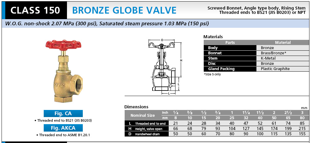 Thông số kỹ thuật của Van góc hiệu Kitz, thân đồng, lắp ren, Model CA, Class 150: